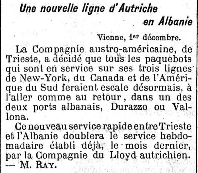 Le Figaro (1913) – Krijimi i linjës së re detare që do të lidhë Durrësin dhe Vlorën me Nju Jorkun, Kanadanë dhe Amerikën e Jugut December 2, 2018 Burimi : gallica.bnf.fr / Bibliothèque nationale de France Nga Aurenc Bebja*, Francë – 2 Dhjetor 2018 … Read More twitterFollowfacebooklinkedin LEXO MË SHUMË