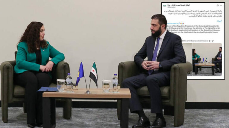Siria do të njohë Kosovën: Osmani- Ahmed al-Shaara, dy presidentët takim për herë të parë në Antalia April 12, 2025 Siria së shpejti mund ta njohë Kosovën për shkak të ndikimit turk, sipas ekspertëve të … Read More twitterFollowfacebooklinkedin LEXO MË SHUMË