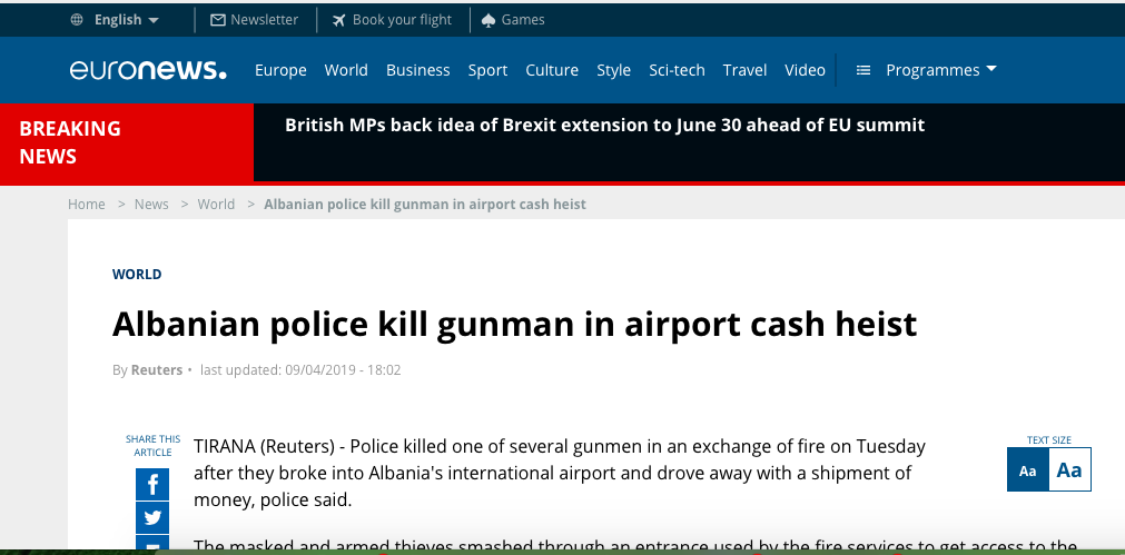 Supergrabitja në Rinas, Bild: Krimi i organizuar vepron shpesh në Shqipëri April 11, 2019 Grabitja e 10 milionë eurove në Rinas ka bërë jehonë edhe në mediat botërore. Gazeta … Read More twitterFollowfacebooklinkedin LEXO MË SHUMË