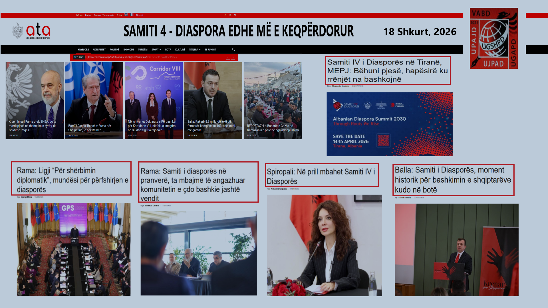 UGSHPD: SAMITI 4 – DIASPORA EDHE MË E KEQPËRDORUR February 18, 2026 (A mund t’i përgjigjen shqiptarët jashtë atdheut ftesës së një qeverisje të korruptuar?) Mes shumë … Read More twitterFollowfacebooklinkedin LEXO MË SHUMË