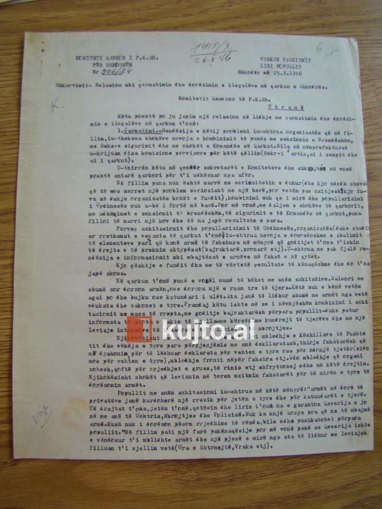 Dokumenti sekret i vitit 1946: “Po pushkatojmë nga nji në çdo fshat, që t’i frikësojmë” November 9, 2018 Dokumenti i 25 tetorit 1946: Pushkatuam një pronar në Breg të Matës, një bajraktar në … Read More twitterFollowfacebooklinkedin LEXO MË SHUMË