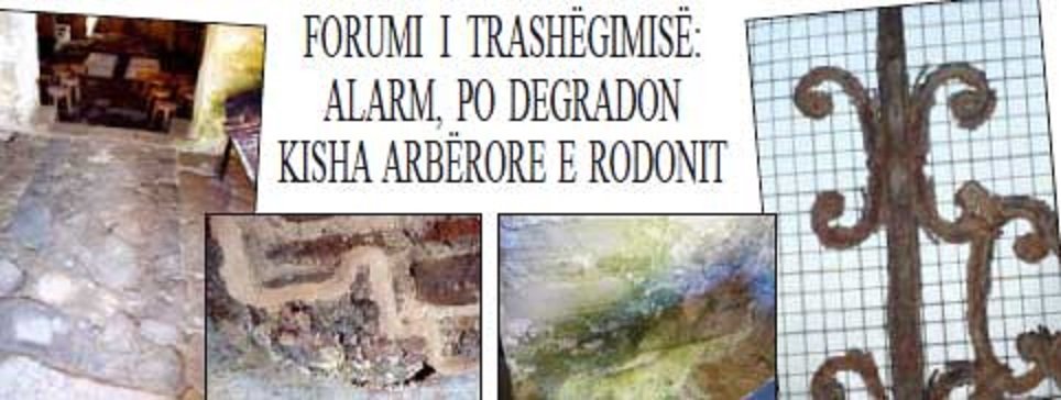 Forumi i Trashëgimisë jep alarmin: po degradon kisha arbërore e Rodonit January 10, 2016 TIRANE – Forumi për Mbrojtjen e Trashëgimisë Kulturore ka dhënë alarmin për kishën e Shna … Read More twitterFollowfacebooklinkedin LEXO MË SHUMË
