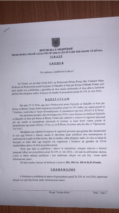 Nxjerrja e përgjimeve nga “BILD”, Krimet e Rënda urdhër: Ndalohet publikimi i akteve të dosjes 339 June 5, 2019 Pas publikimit të 6 audiopërgjimeve nga gazeta prestigjoze gjermane, BILD, Prokuroria e Krimeve të Rënda … Read More twitterFollowfacebooklinkedin LEXO MË SHUMË