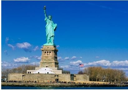Statuja e Lirisë në Nju Jork –ikonë e lirisë dhe e Shteteve të Bashkuara: shenjë mikpritëse për emigrantët që vijnë nga larg, me mbishkrimin: “Më jepni të lodhurit, të varfërit, turmat e kruspulluara, ata që dëshirojnë të marrin frymë lirisht”.