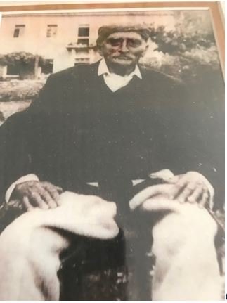 Gjyshi im Luk Toma i Shkrelit (krenaria e familjes dhe shtylla e fisit tonë të madh) para shtëpisë ku kam lindur, Amull – Ulqin, 1950.