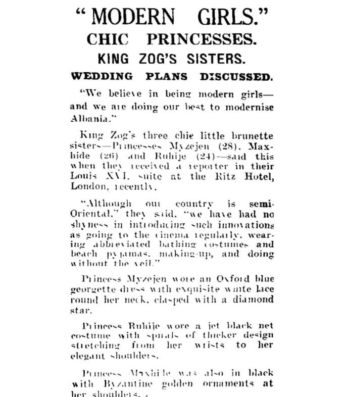 The Auckland Star (1938) “Ne besojmë në të qenit vajza moderne…” — Intervista me Myzejen, Ruhije dhe Maxhide Zogu në Londër