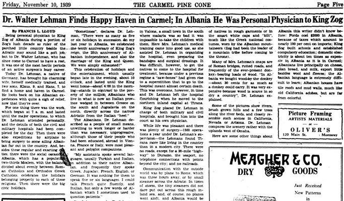 Të jesh mjek personal i Mbretit Zog të Shqipërisë gjatë një pjese të dekadës së harlisur të Zogut si sundimtar i vendit të vogël të tharë pranë Adriatikut mund të tingëllojë si një punë e lehtë, por për Dr. Walter Lehman, i cili që atëherë ka ardhur në Carmel për të pushuar, ishte një nga periudhat më plot ngjarje të karrierës së ngjeshur të një kirurgu aktiv.
