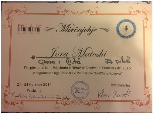 Jora është fituese e Mirënjohjes për pjesëmarrje në Edicionin e Nënt të Festivalit “Pianisti i Ri”,2016,organizuar nga Shoqata e Pianistëve “Bell’Arte Kosova”,nga 21.24.qershorë 2016,në Prishtinë.