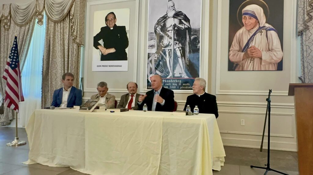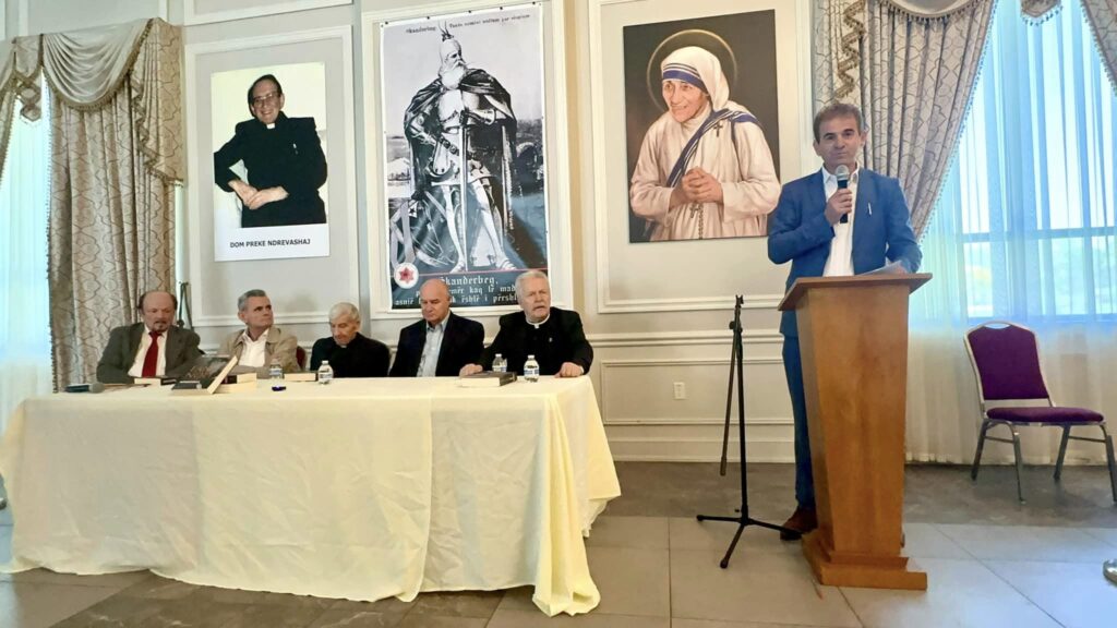 Pastaj fjalën e mori famullitari Dom Ndue Gjergji, i cili uroi autorin per këtë vepër të madhe dhe tha: “… shqiptarët nëse deshirojnë të balafaqohen me sfidat e botës së sotme duhet të qëndrojnë të bashkuar, se të gjithë jemi vllazën e motra besimtarë në një Zot, sikurse e pati thënë Papa Françesku: ”Në Shqipëri gjeta jo nje harmoni fetare, por një vllazni fetare”. Për kombin tonë nuk ka asnjë rrugë tjetër përveç vllaznimi dhe bashkimi kombëtar. Sikurse ne kemi hapur këtë sallë dhe kyt Qendër të kulturës për festa, promovime, për fmijët, për gjuhen shqipe dhe aktivitete të kulturës shqitarë, ta hapim edhe ne zemrën për idealet e mëdhaja të kombit tonë, dhe tuej dashtë kombin dhe tokat tona ta bajmë kyt bashkim kombëtar, i cili, mos keni kurrfarë frige, do t’i përballojë të gjitha rreziqet dhe kërcënimet që kanosen prej armiqve tanë”.