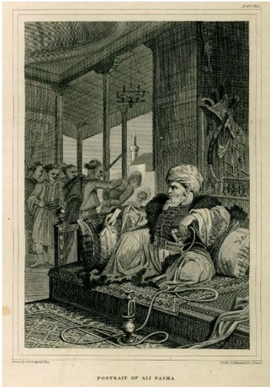 Portreti i Ali Pashës (1820), vizatuar nga bashkudhëtari e miku i Hughes-it Ch. R. Cockerell. Kjo gravurë u realizua gjatë disa seancave kur Cockerell-i ftohej në saraj nga Veziri.