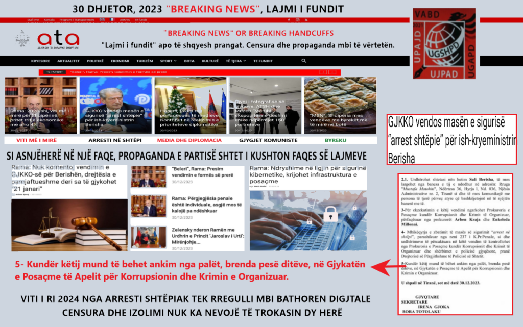 Lajmet pambarimisht do ta tjerrin temën se; GJKKO-ja do të mblidhej mesditën e së Shtunës për marrjen e vendimit. E shtunë 30 Dhjetor, një ditë para mbylljes së vitit 2023, situata më e gjetur për t’ju shprehur sipas interesave kënaqësinë, hidhërimin apo heshtjen. Ky sot është modeli i lajmit propagandisti që i imponohet “qytetarit të lirë” jo thjeshtë nga censura, por nga epshi propagandistik i pushtetit. Si askush tjetër në ATSH, është faqja lajmit të ndërtuar edhe kësaj të Shtune, 30 Dhjetor 2023. Një ditë që kujtesa e shqiptarëve që e duan vërtetë demokracinë dhe pluralizmin duhet ta ruajnë mirë në kujtesë dhe të kuptojë se me këto masa të partisë shtet, liria kërcënohet në orët e fundit që ky vit po del dhe po kështu do ta përndjekin orët, ditët javët dhe muajt e vitit të ri 2024, si vit i zgjedhës me polic mbi krye.