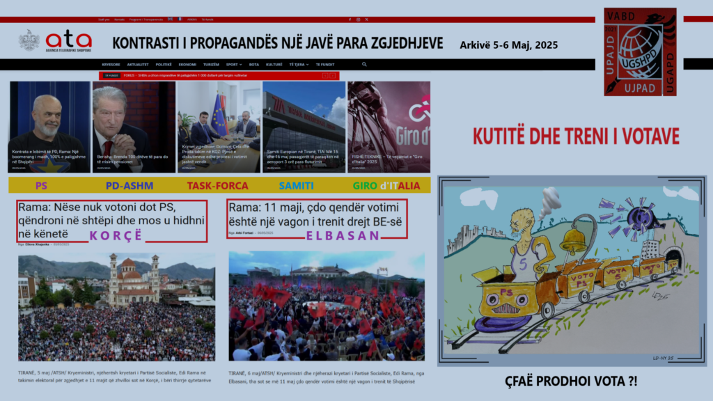 Duke ju rikthyer dy deklaratave të kryeministrit Rama gati pesë ditë para zgjedhjeve të 11 Majit, 2025 skica e autorit LD-NY25 me diçiturën “Treni i votave” risjell në kujtesën e zgjedhësve dy motive propagandistike të pushtetit që sot të vërtetojnë atë pjesë të farsës zgjedhore 2025 në Shqipëri ku për të parën herë u përfaqësua e kufizuar diaspora. Presioni për të mos votuar mes qytetarëve të Korçës:- “Në qoftë se nuk votoni PS, qëndroni në shtëpi më mirë dhe mos u hidhni në kënetë” ishin një tregues se përse shqiptarët morën pjesë 42.16%. Dhe tjetra që e përforcoi stacionin e Pekishtit në qarkun e Elbasanit me fenomenin e “Trenit Bullgar” treguan jo vetëm për kontrollin e plotë dhe blerjen e votës, por ishin sinjali paralajmërues se çdo kuti votimi do t’i ngjante një:-“…11 maji çdo qendër votimi një vagon i trenit BE-së”.