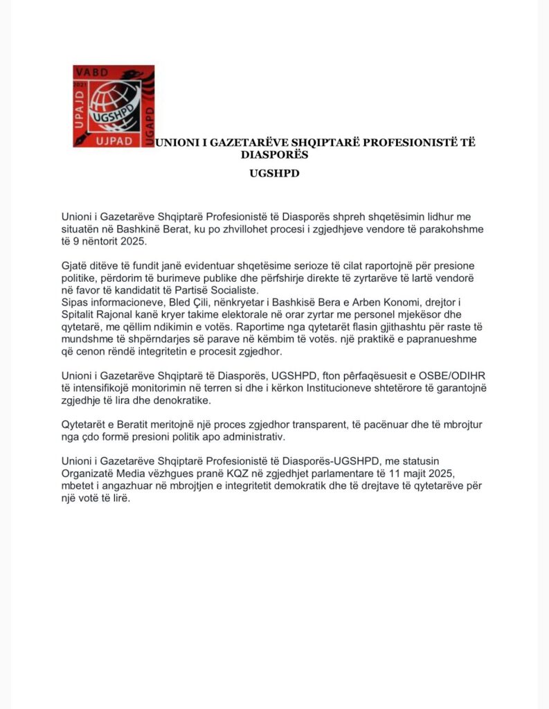 Unioni i Gazetarëve Shqiptarë Profesionistë të Diasporës – UGSHPD shpreh shqetësimin lidhur me situatën në Bashkinë Berat, ku po zhvillohet procesi i zgjedhjeve të parakohshme vendore të 9 nëntorit 2025.