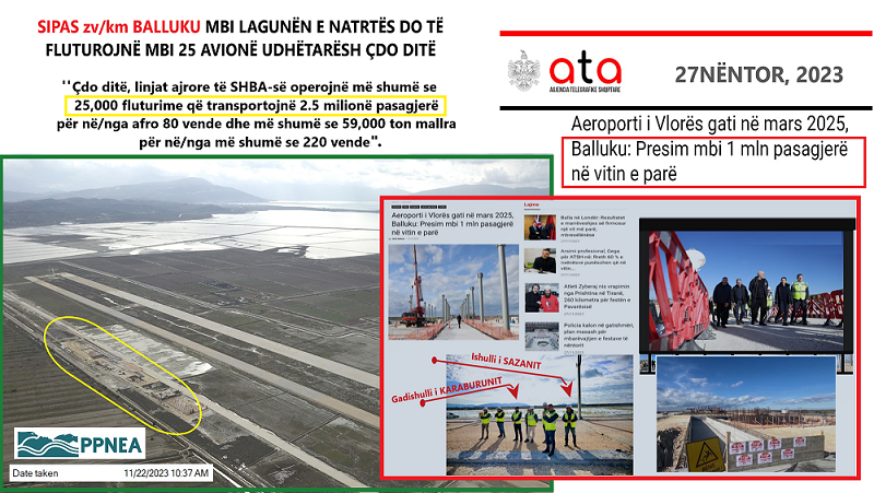 Absurdi i faktit është se zv/km B. Balluku pretendon se 1 milion pasagjerë do të përpunohen vetëm vitin e parë nga aeroporti i Vlorës që po pushton Lagunën e Nartës. (shkruar në ATSH).