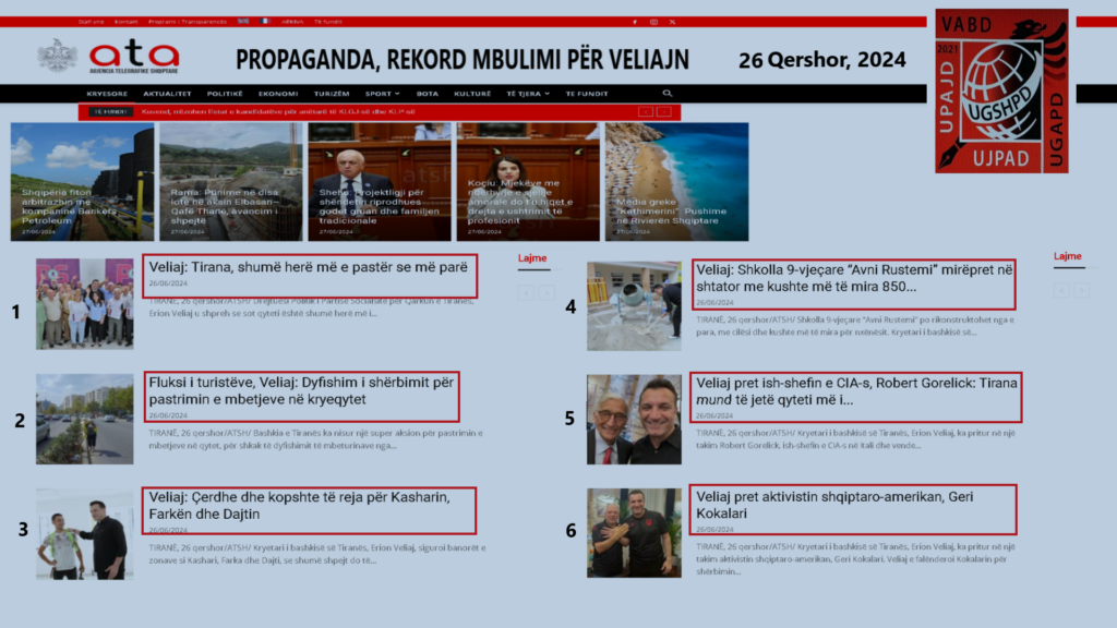Por pa dashur të ndikojmë opinionin e lexuesit, do t’ju tregojmë përmes monitorimit se si prodhohen lajmet për Veliajn. Do t’ju rendisim vetëm titujt e ATSH brenda datës 26 Qershor dhe prej aty do të kuptoni menjëherë se i njëjti formulim i përcillet mediave audio-vizive kombëtare dhe solistët femra e meshkuj ( gazetare/ë dhe spikere/a), i përsërisin ato si lajme dite lokale. Një influencë dhe propagandë e investuar për të mashtruar publikun për të treguar se Veliaj është çdo ditë menaxheri punëmbaruar i kryeqytetit dhe udhëheqësi politik i qarkut të Tiranës me një popullsi gati 1 milionëshe.