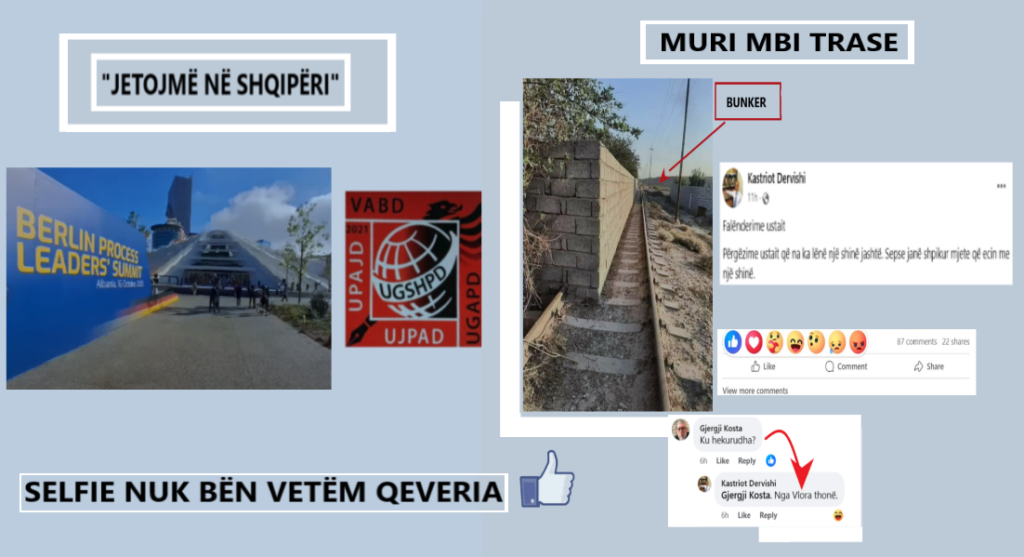 Pa marrë forcën e ndonjë jurie artistike, UGSHPD çmon diçiturën e dy realiteteve që jetojnë brenda një jave në Shqipëri, përmes dokumentit fotografik të ngjarjes. Si u përdor “Samiti i Berlinit” para dhe pas zhvillimit të tij një ditor në Tiranë për mburrjen dhe kultin e individit. Ju mund ta merrni me mend se që prej ATSH, RTSH dhe mediave pranë pushtetit propaganda fund e krye ngriti vetëm një personazh, Kryeministrin Rama. Mbase për gjithë këto arritje dhe udhëheqje dhjetëvjeçare duhet me menduar seriozisht edhe për një shtatore të tij diku pranë qendrës së kryeqytetit, pasi AI mbetet i vetmi deri më sot që po e shpie Shqipërinë përpara. Por çfarë thotë foto tjetër përkrah, mendojmë se është thelbi i asaj që Shipëria duhet të vajtojë. Pak rëndësi ka se kush pronar jeton prapa murit mbi trasenë e hekurudhës, pa parti apo edhe i majtë apo i djathtë qoftë.