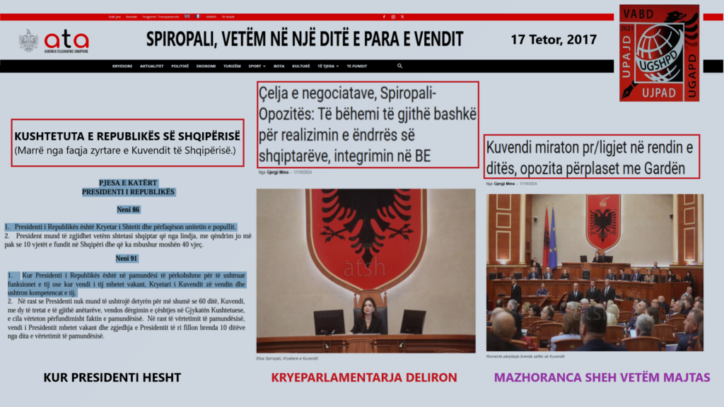 Nuk do të merremi në këtë trajtim me mënyrën e protestave në Kuvendin e Republikës së Shqipërisë brenda dhe jashtë tij sepse jashtë përmbajtjes së përplasjeve të dy situatave që lidhen me mënyrën se si zbatohet ligji në Kuvend dhe se sa hapur e në mënyrën më skandaloze dhe amatore zbatohet me urdhrat e kryeministrit propaganda e Rilindjes Socialiste po në Kuvend, 17 Tetori 2024 është një ditë historike për dekadencën e parlamentarizmit, në qoftë se Shqipëria do të mundet ta ruaj një si të tillë.