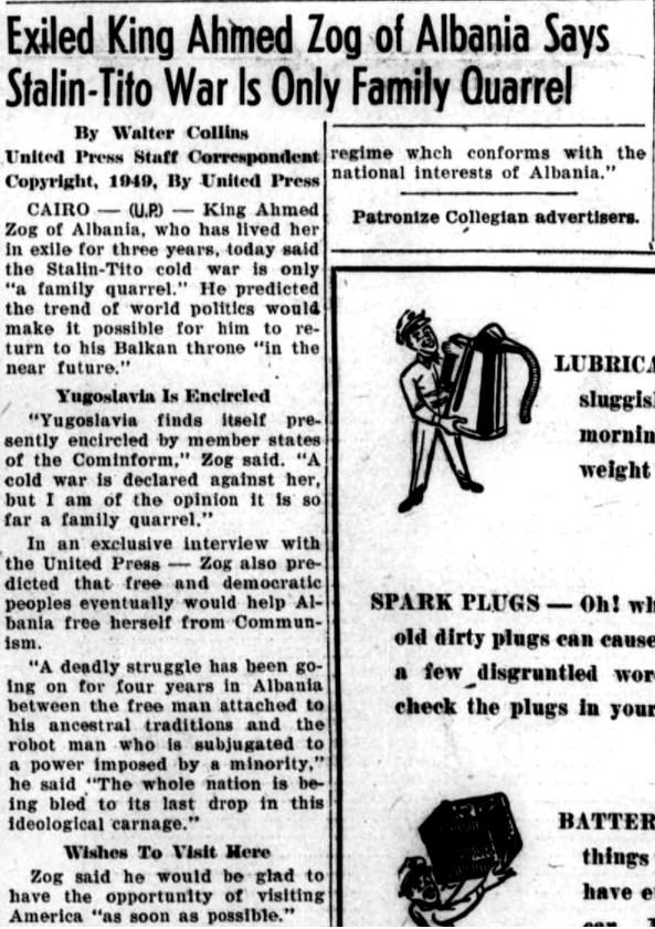 United Press (1949) / Intervista me Mbretin Zog : “Një luftë vdekjeprurëse ka vazhduar për katër vjet në Shqipëri