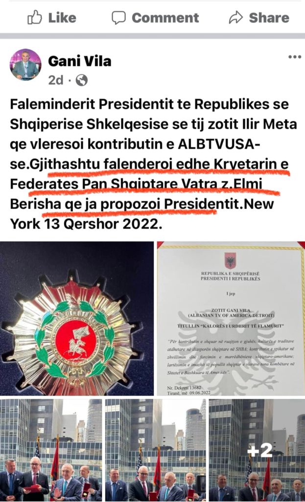 Urime dhe suksese grupit te vatraneve! Dhashte Zoti paqe ne Vater dhe Vatra te kthehet ne binare kushtetues dhe ne misionin e saj perbashkues dhe mbrojtes te interesave shqiptare ne USA.”, përfundon Valentin Lumaj.
