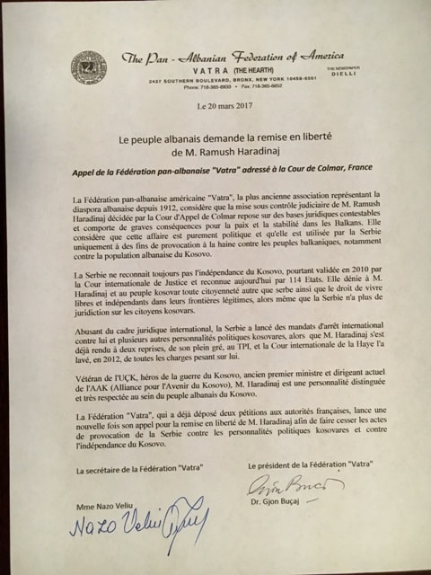 “Vatra” letër gjykatës franceze: Lironi Ramush Haradinajn!