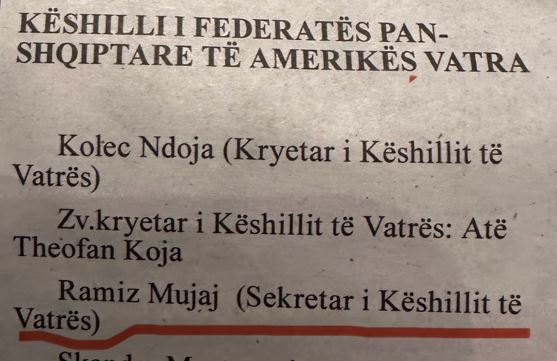 Shkrimin e Vatranit Veteran Ramiz Mujaj po e ilustrojmë me një foto arkivi i Cezar Ndreut – dëshmi e qartë e përbërjes së Vatrës – Lartë në foto nga e majta Zef Perdocaj, Dalip Greca, Jonuz Ndreu, Agim Rexha, Zef Bala, Ramiz Mujaj, Marjan Cubi, Besim Malota, Idriz Lama – Ulur ne tavoline Gjon Bucaj, Akademiku Mark Krasniqi, Ing.Agim Karagjozi, Musli Mulosmani – Tash Vatra asht zëvendësu nga shakllabana sikur do t’i quante poeti kombëtar Gjergj Fishta.