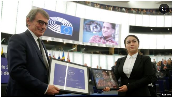 Çmimin në vend të tij e pranoi e bija, Jewher Ilham në një ceremoni në Parlamentin Evropian në Strasburg.