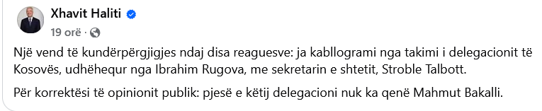 VOAL- Veton Surroi, i cili ishte pjesë e delegacionit në Uashington të udhëhequr nga Ibrahim Rugova, në një reagim të tij në fb përgënjeshtroi Xhavit Halitin, i cili të martën deklaroi në programin “Frontal” të T7 se “Rugova i përshkroi anëtarët e UÇK-së dhe Fatos Nanon si ekstremistë”. Të mërkurën, ai publikoi një transkript që ai pretendonte se ishte nga takimi. Aty thuhet se “Rugova i përshkroi shumë anëtarë të UÇK-së si të frustruar”.