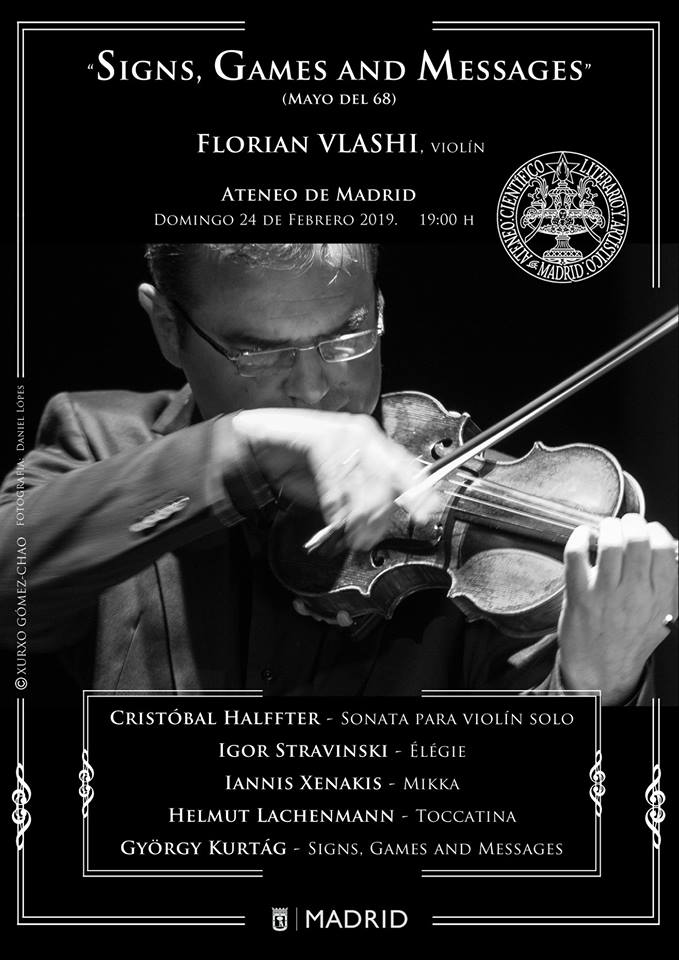 Koncerti recital i rradhës i violinistit virtuoz Florian Vlashi mbahet në Ateneo de Madrid më 24 shkurt 2019 dhe titullohet “Signs, Games and Messages”