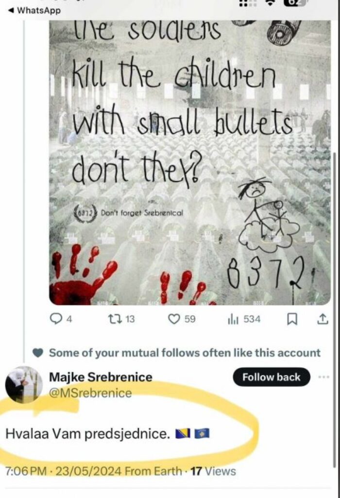 “Është thelbësore për shërimin dhe paqen e qëndrueshme, për t’u ofruar paqe nënave të Srebrenicës dhe të gjithë anëtarëve të mbijetuar të familjes, duke siguruar që të dashurit e tyre të mos harrohen kurrë”, ka shkruar presidentja në platformën X.