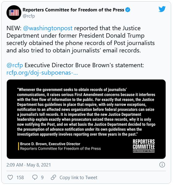 Bruce Brown, drejtor ekzekutiv i Komitetit të Gazetarëve për Lirinë e Shtypit, tha se kjo “ngre shqetësime serioze rreth amendamentit të parë”.