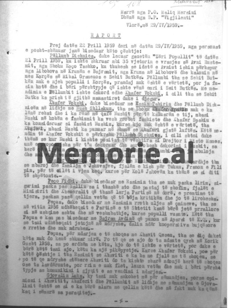 Në këtë rast, nuk mund të mos përmend, kontributin që keni dhënë juve në këtë drejtim. Të dhënat tuaja që nga viti 1951 e deri ditën që jeni kthyer në Atdhe, mbi veprimtarinë e Zbulimit Amerikan dhe Grek e kanalet që kanë përdorur që nga Konispoli deri në Korçë, si dhe për personat në shërbim të këtyre zbulimeve, si; Haki Rushiti, Rushit Plaku, Rasim Aliu, Ramadan Fehimi, Spiro Zharkalliu, Skënder Bllacin, Gaqo Mujon, Jani Kovaçin, Javer Alikon, Xhafer Aliun, Xhemal Hoxhën, Shefqet Sallarin, etj., ndihmuan më vonë në zbulimin dhe goditjen e armiqve, sikurse janë: Teme Sejko, Tahir Demi, Abdyl Resuli, Hajri Mane, Nasho Gërxho, etj.
