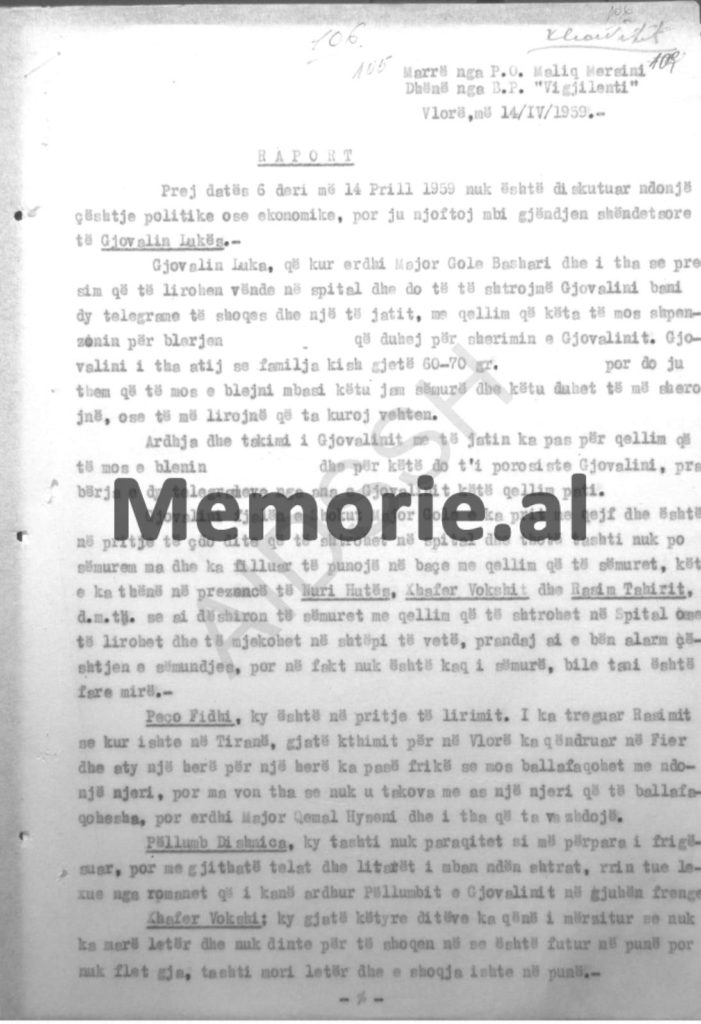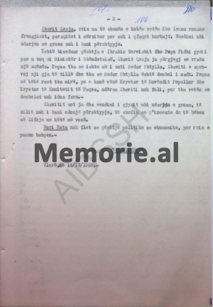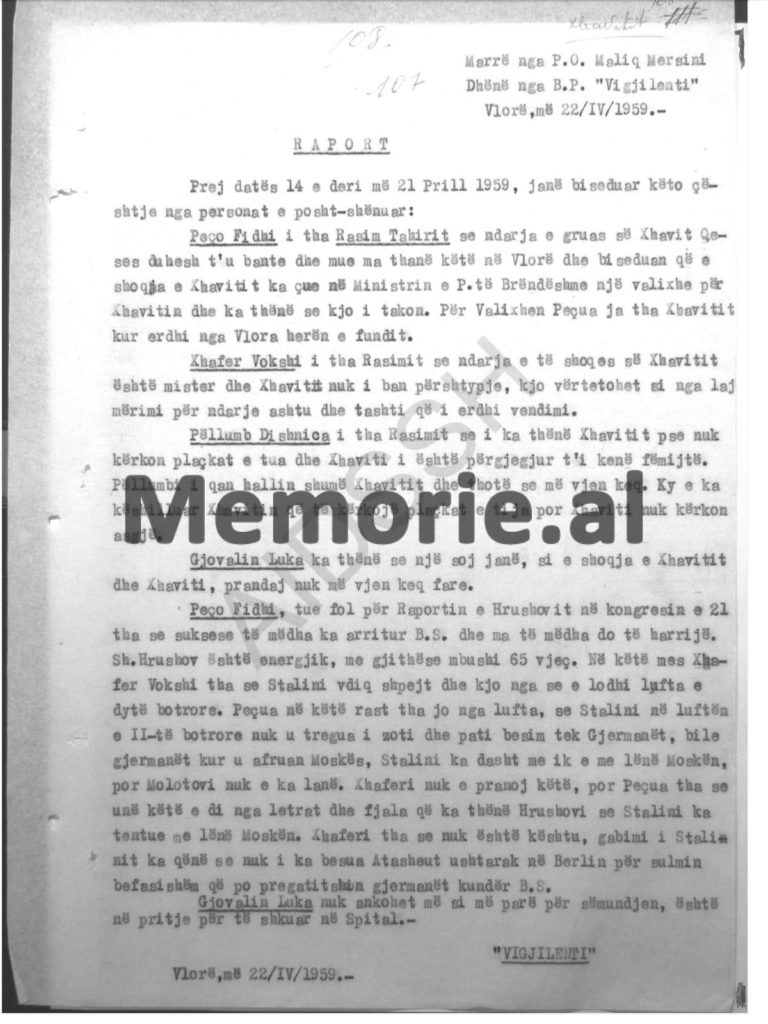 Për periudhën 1 janar 1955, 30 mars 1957, t’i thuhet se shpërblimi i caktuar nuk i jepet, për arsye se nuk ka vepruar sipas udhëzimeve tona, dhe si konsekuencë ka shkëputur lidhjet me zbulimet e huaja dhe nuk ka treguar interesim për zbatimin e detyrave të ngarkuara.