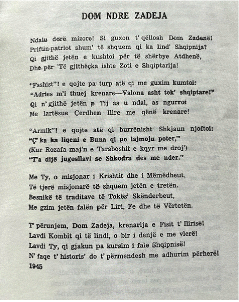 Poezi nga Xhevat Kallajxhi — ish-redaktor i Zërit të Amerikës dhe kryeredaktor i gazetës Dielli, organ i Federatës Pan-Shqiptare Vatra në Amerikë – kushtuar Dom Ndre Zadejës me rastin e pushkatimit të tij në vitin 25 Mars, 1945 nga regjimi diktatorial komunist i Enver Hoxhës. (Lot e Shpresa -Vjersha, libër botuar në Amerikë, 1976.