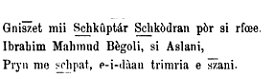 Në strofën e gjashtë të kësaj kënge, në vargjet dedikuar Ibrahim Mahmud Begollit, i cili si luan i priu me shpat në dorë 20 000 Schkgûptàr shkodranë, pra në këtë varg e përsërit emërtimin shqiptarë.