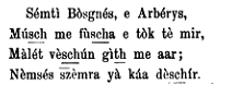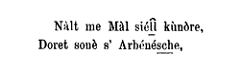 shkruar herë Albania, në të tjerat Arbnya (Arberia), Arbénésche (Arbëreshë), si në vargjet e këngës të katërt: