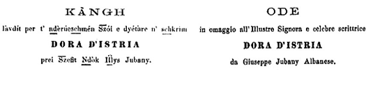 Në myllje të kësaj vepre, janë dy poezi njëra shkruar nga Dom Pjetër Zarishti dhe tjetra një ode, të cilën Jubani ia dedikon zonjës së përndritur dhe shkrimtares se shquar Dora D’Istria.