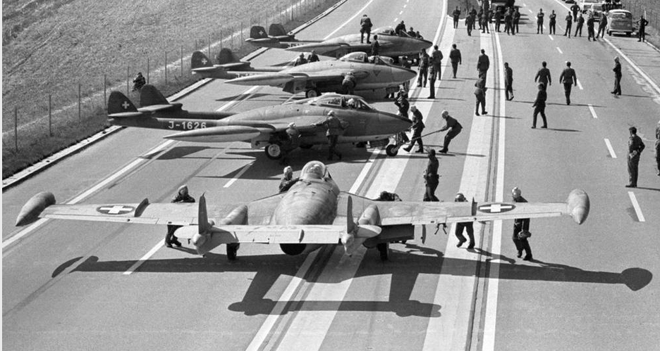 Disa seksione të autostradës (nga Payerne në Flums që kalon përmes Sionit dhe Lodrinos) u ndërtuan me kritere shumë të veçanta (dy kilometra të drejtë, parmakë mbrojtëse të lëvizshme) në mënyrë që të shndërroheshin në aerodrome. Aty u mbajtën gjithashtu disa ushtrime dhe disa orë pas ngritjes së fundit autostrada mund të rihapet. rsi-eb